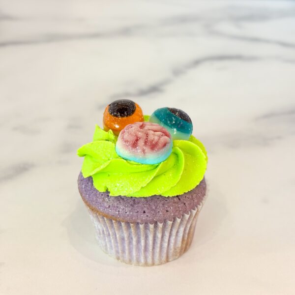 Our signature vanilla bean cake turned purple, frosted with green vanilla bean buttercream, and garnished with ghoulish gummy treats.