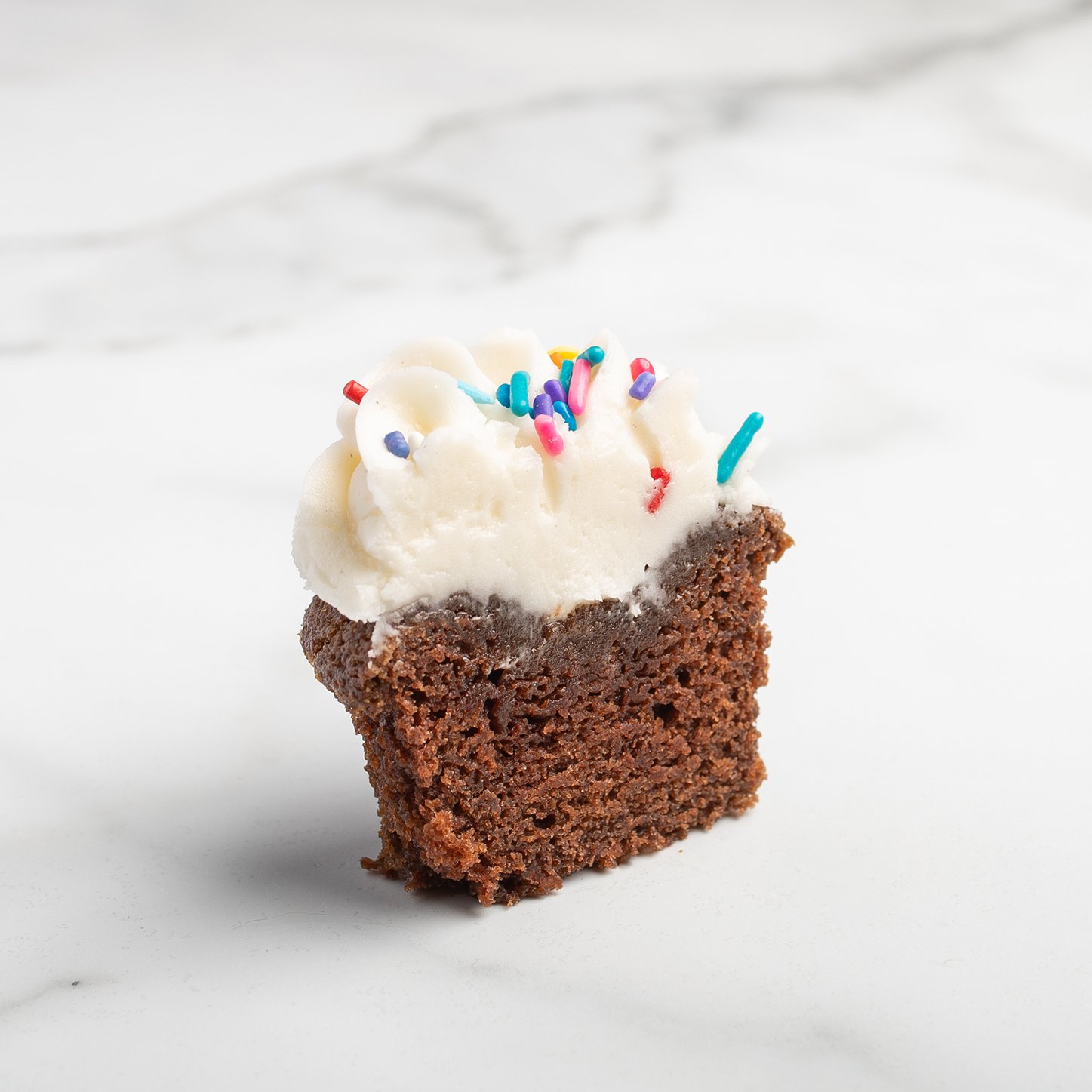 Our signature chocolate cupcake topped with vanilla bean buttercream. Get your party pants on.