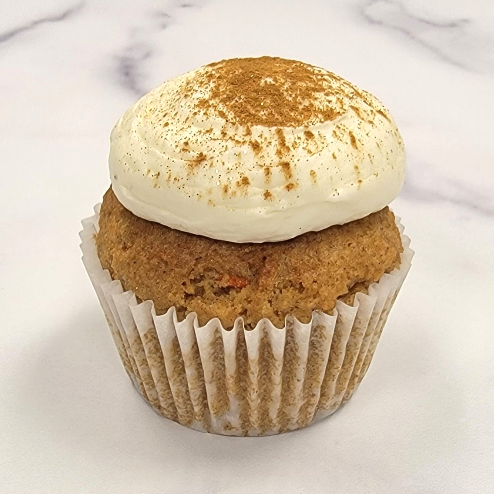 Our lighter carrot cupcake is topped with a whipped, low sugar cream cheese buttercream, sprinkled with cinnamon, then kissed with glitter and magic.