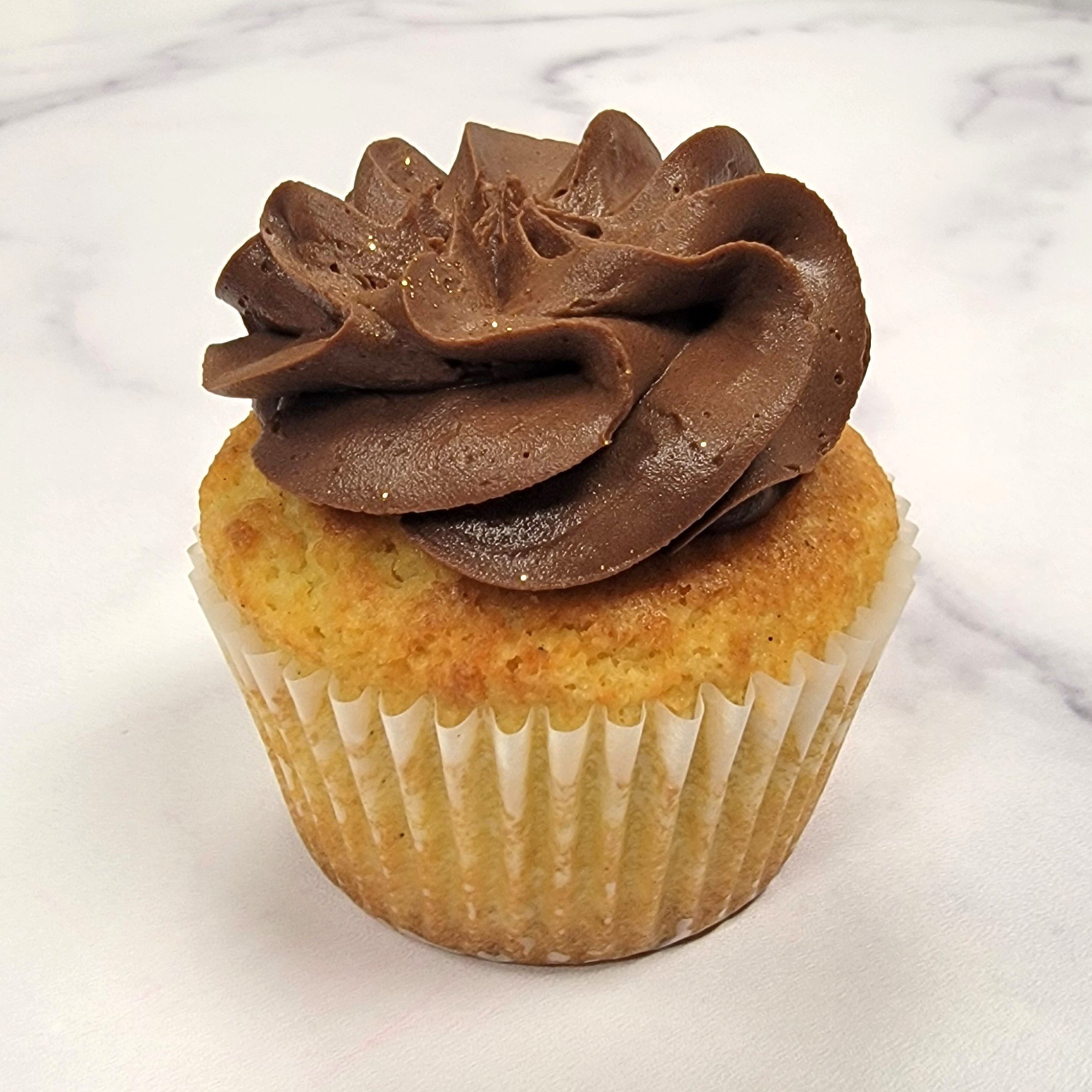 Our lighter vanilla cupcake is topped with a whipped, low sugar chocolate buttercream, then kissed with glitter and magic.