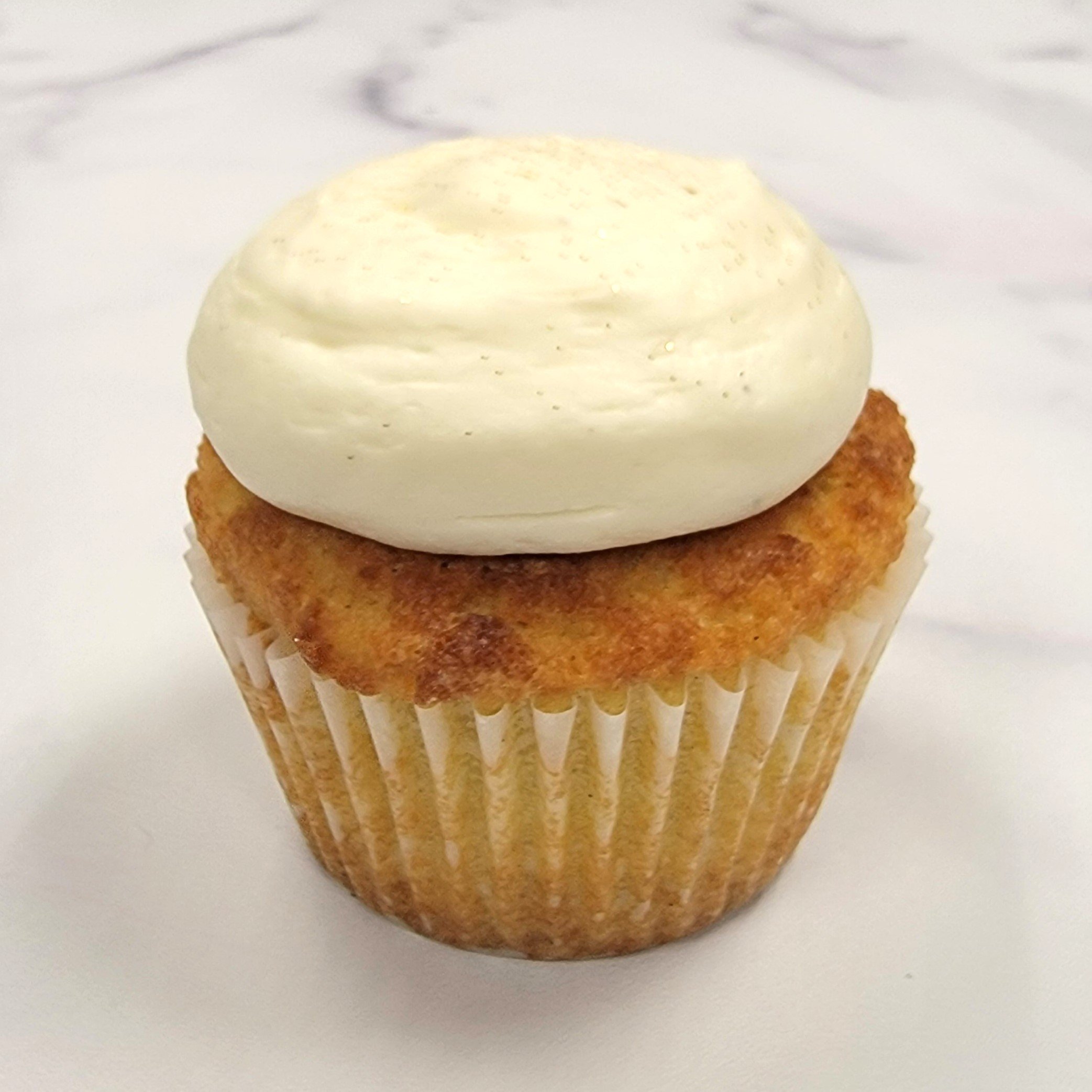 Our lighter vanilla cupcake is topped with a whipped, low sugar cream cheese buttercream, then kissed with glitter and magic.