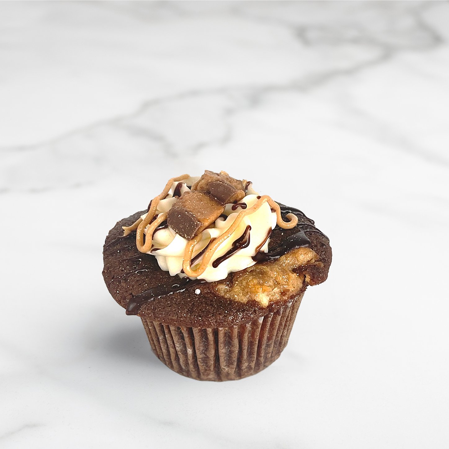 Our signature chocolate cupcake, peanut butter cheesecake, crushed peanut butter cups, and cream cheese frosting.