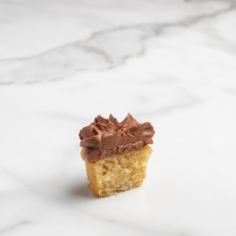 A moist vanilla almond cupcake topped with chocolate frosting and sprinkles. Classic.