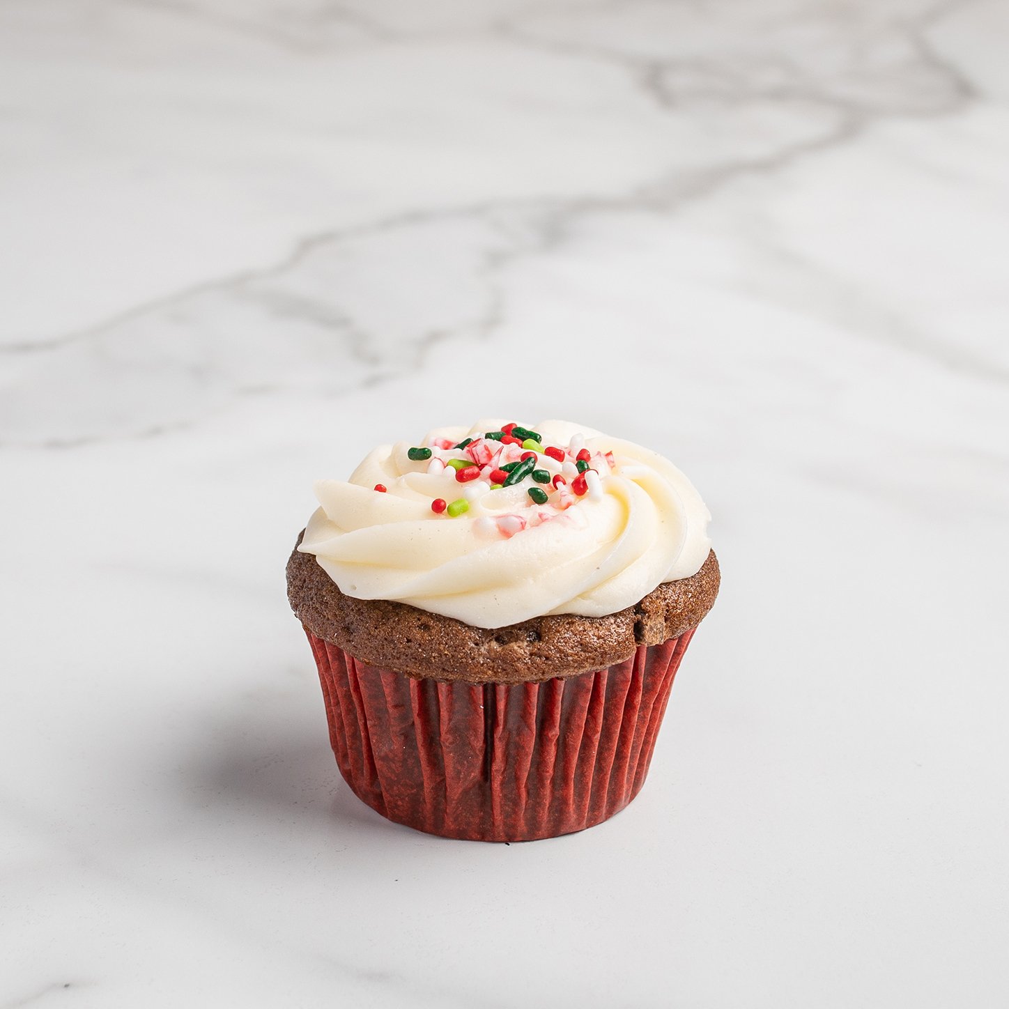 Our signature chocolate cupcake with chopped peppermint bark folded into the batter, topped with cream cheese frosting and topped with a wintery sprinkle mix.