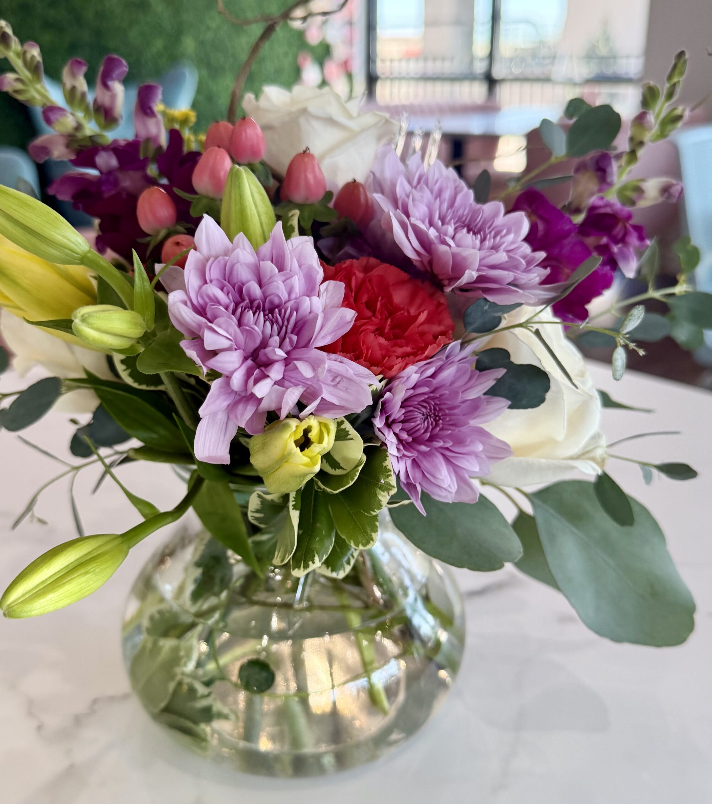 Why not send beautiful and cheerful flowers along with your cupcake and treat deliveries? Did you know Oh My Cupcakes! now has gorgeous floral bouquets made in-house? Our medium flower bouquet is a perfect add on. Designs may vary based upon seasonality of flowers and greens.
