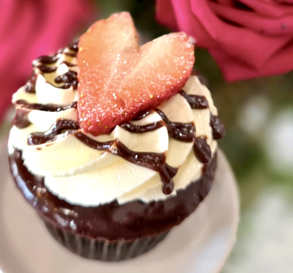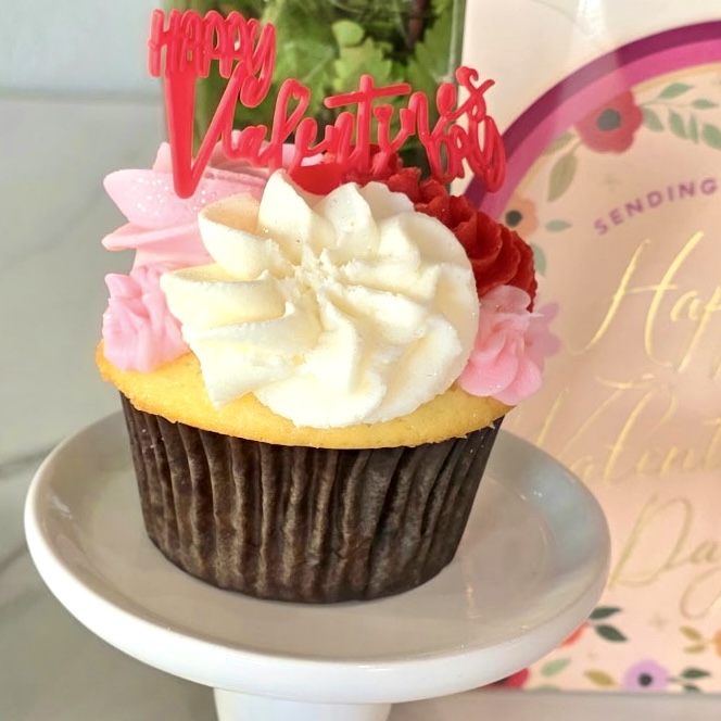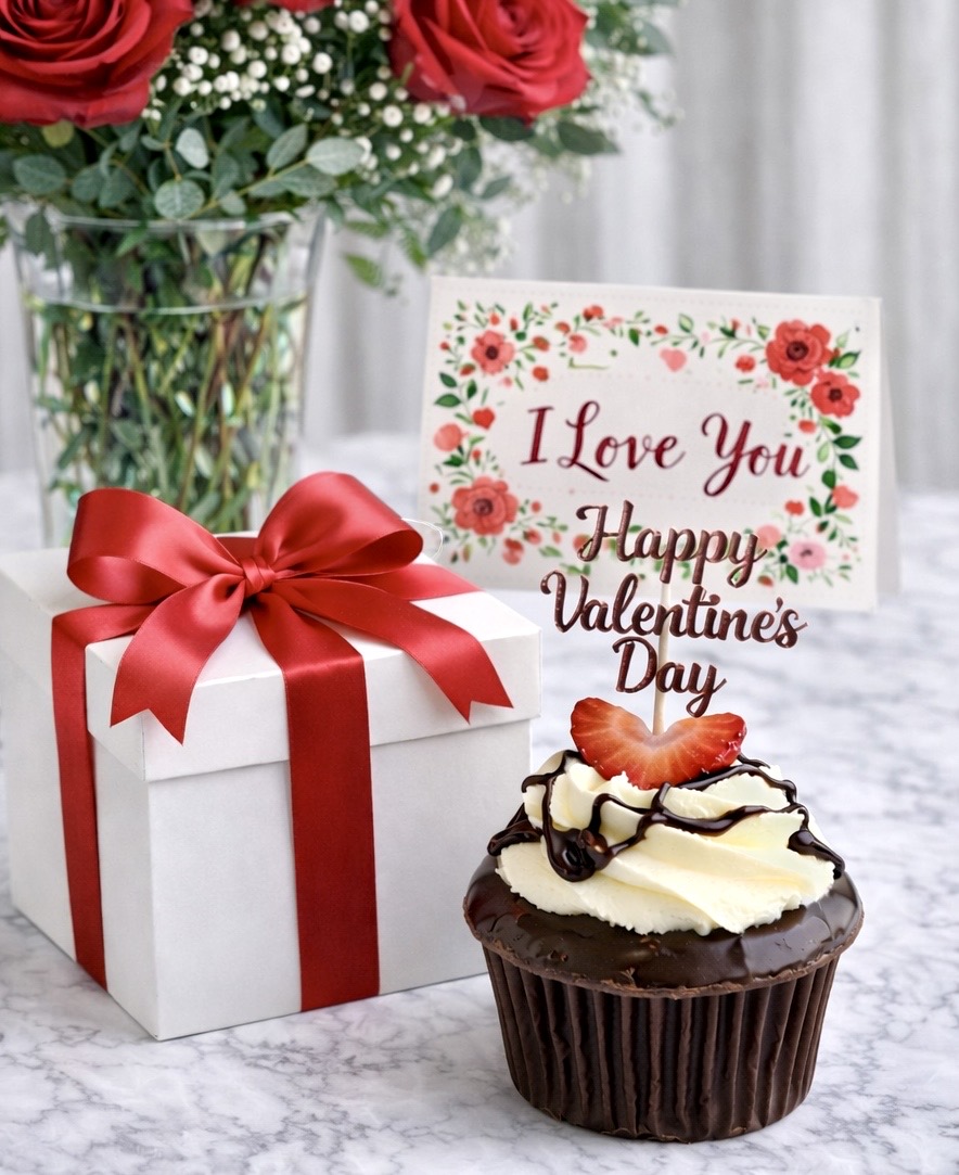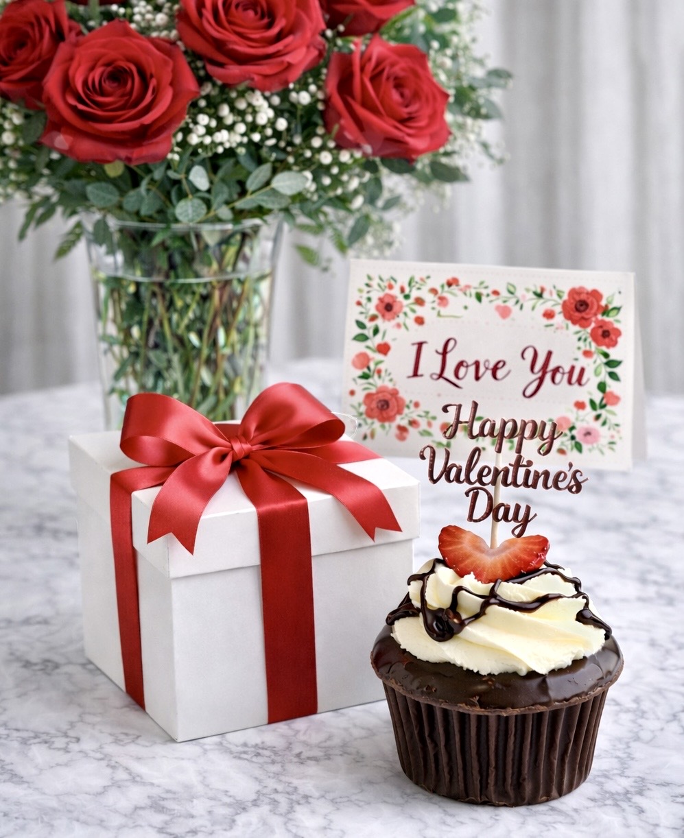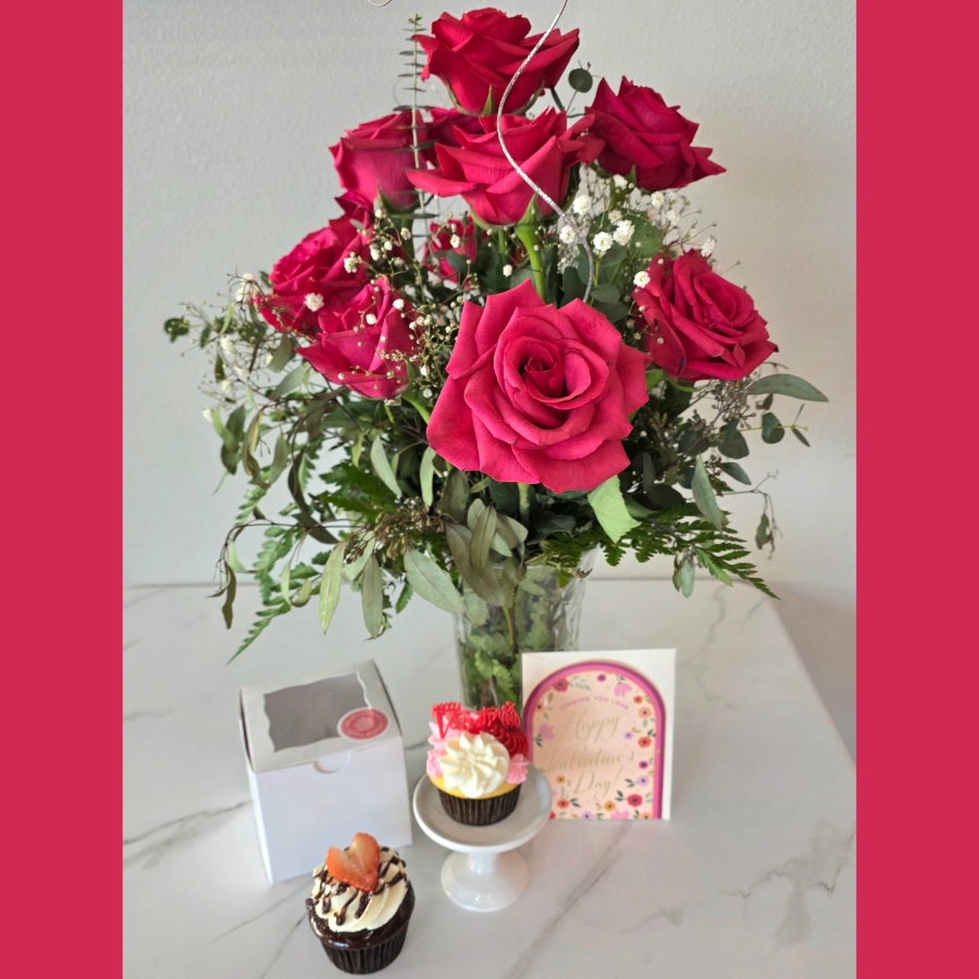 A thoughtfully curated Valentine’s gift featuring one dozen roses in a vase with baby’s breath and greens, a premium cupcake beautifully boxed and bowed (choice of Valentine Vanilla or Chocolate Covered Strawberry) a Valentine greeting card with your message inside, and local delivery. Send these early in the week! She’ll be the first in her office to receive her Valentine, and you’ll be the hero who made it happen.
