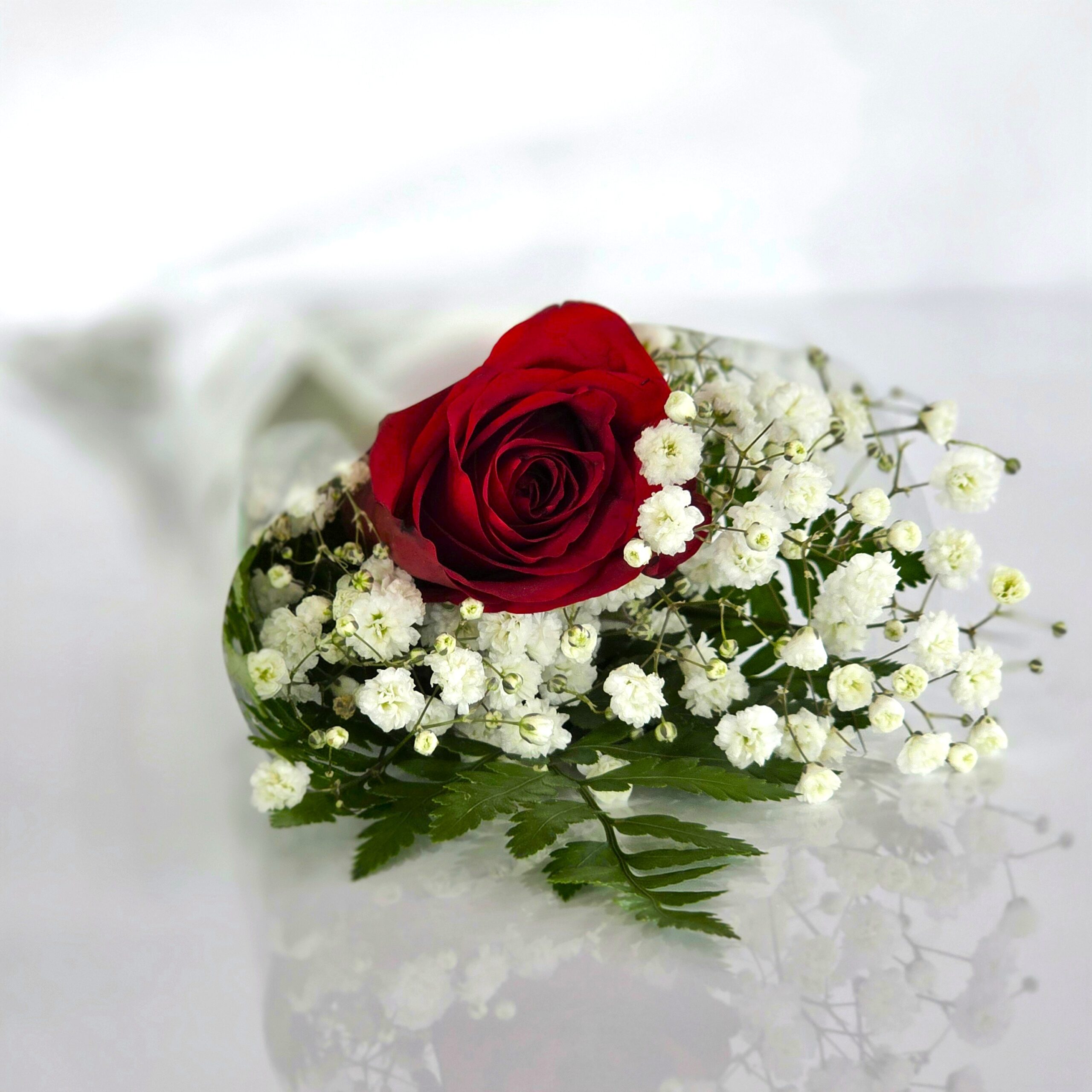 One single classic rose accented with baby’s breath and fresh greenery. It’s a lovely gesture that says so much.